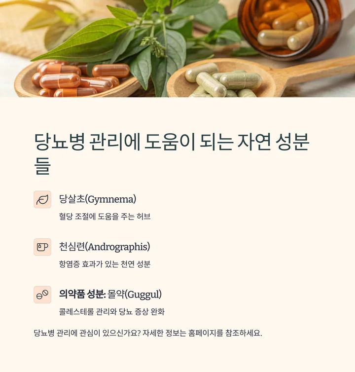 • 부추잎(Buchu leaf), 천심련(Andrographis), 아르주나(Arjuna), 인도사목(Rauwolfia)