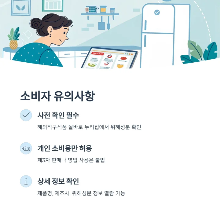 - 해외직구식품은 개인 소비용으로만 사용해야 하며, 제3자 판매나 영업 사용은 불법