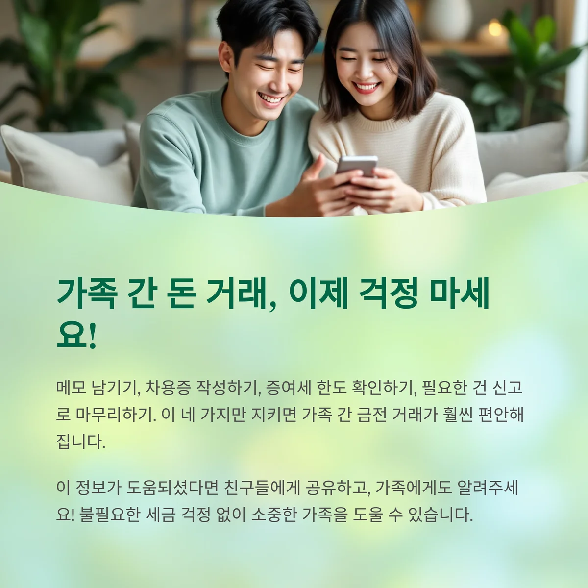 이 네 가지만 지키면, 국세청의 조사 대상이 될 일도 없고, 가족 간 금전 거래가 훨씬 편안해질 수 있습니다.
