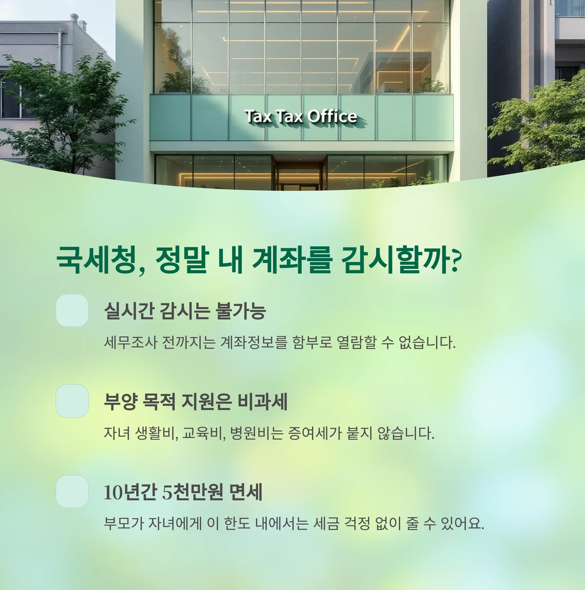 우선 “국세청이 실시간으로 계좌이체를 감시한다”는 얘기, 사실이 아닙니다. 우리 계좌의 정보는 세무조사가 시작되기 전까지는 함부로 들여다볼 수 없습니다. 즉, 무턱대고 계좌를 감시하거나 이체했다고 해서 세금이 부과되는 건 아니라는 거죠.