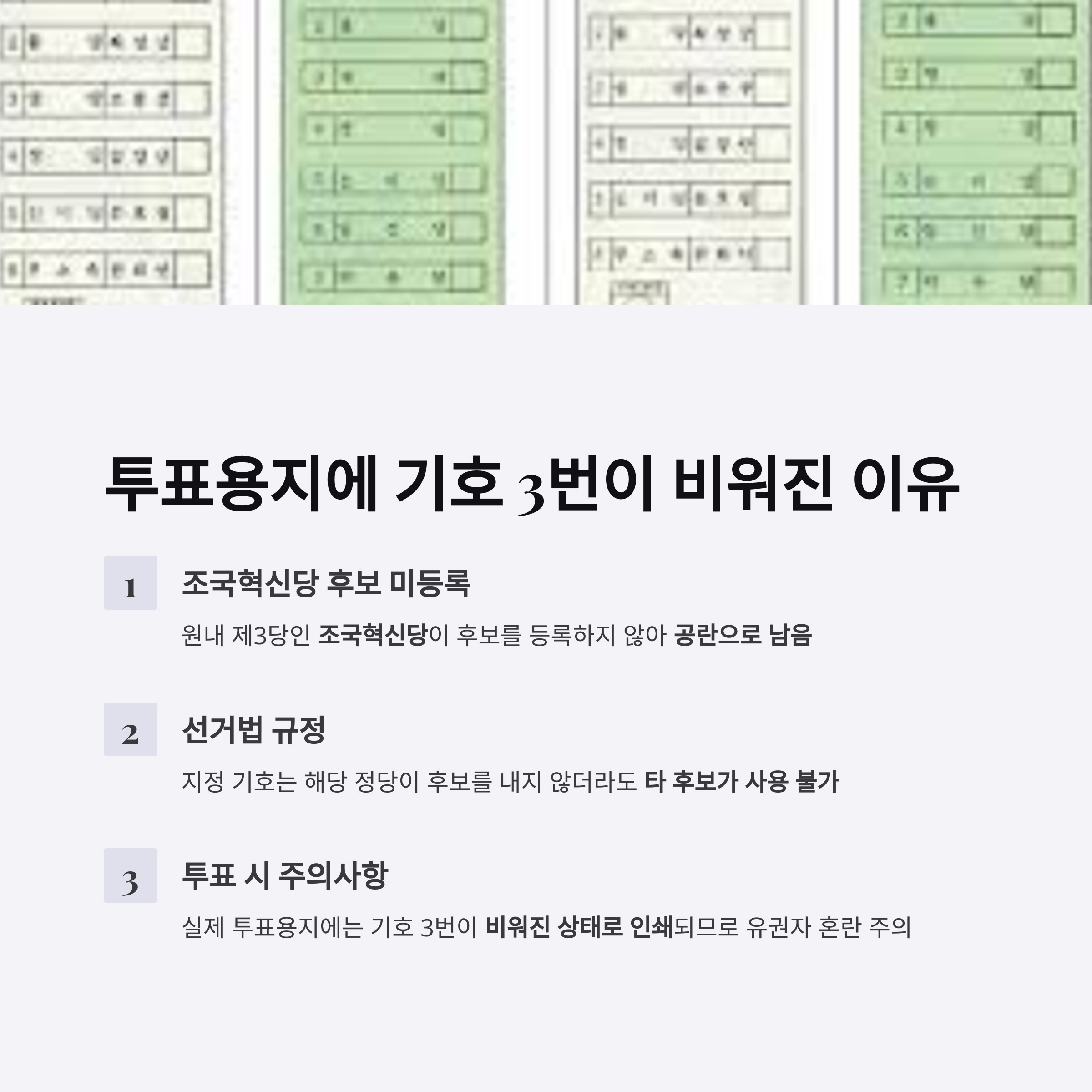 - 실제 투표용지에는 기호 3번이 비워진 상태로 인쇄되며, 유권자는 혼란이 없도록 주의해야 합니다.