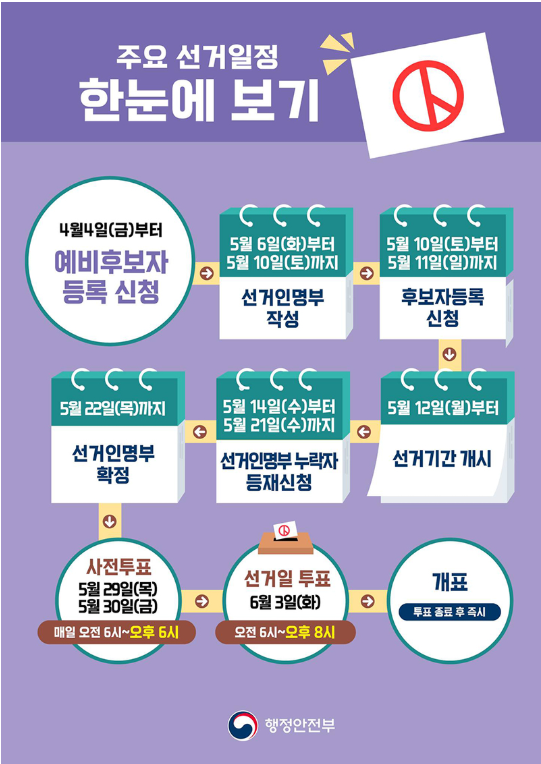 - 5월 14일(수) ~ 5월 21일(수): 선거인명부 누락자 등재 신청