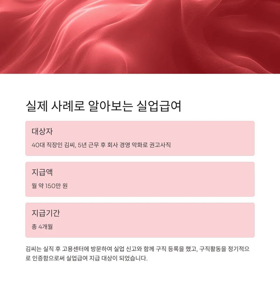 요즘 같은 불황기에 갑작스러운 실직은 누구에게나 올 수 있습니다. 특히 40~60대 직장인에게는 생계를 이어가기 위해 실업급여는 반드시 알아둬야 할 제도입니다. 오늘은 실업급여의 정의부터 조건, 그리고 실제 사례까지 2025년 최신 기준으로 정리해드립니다.