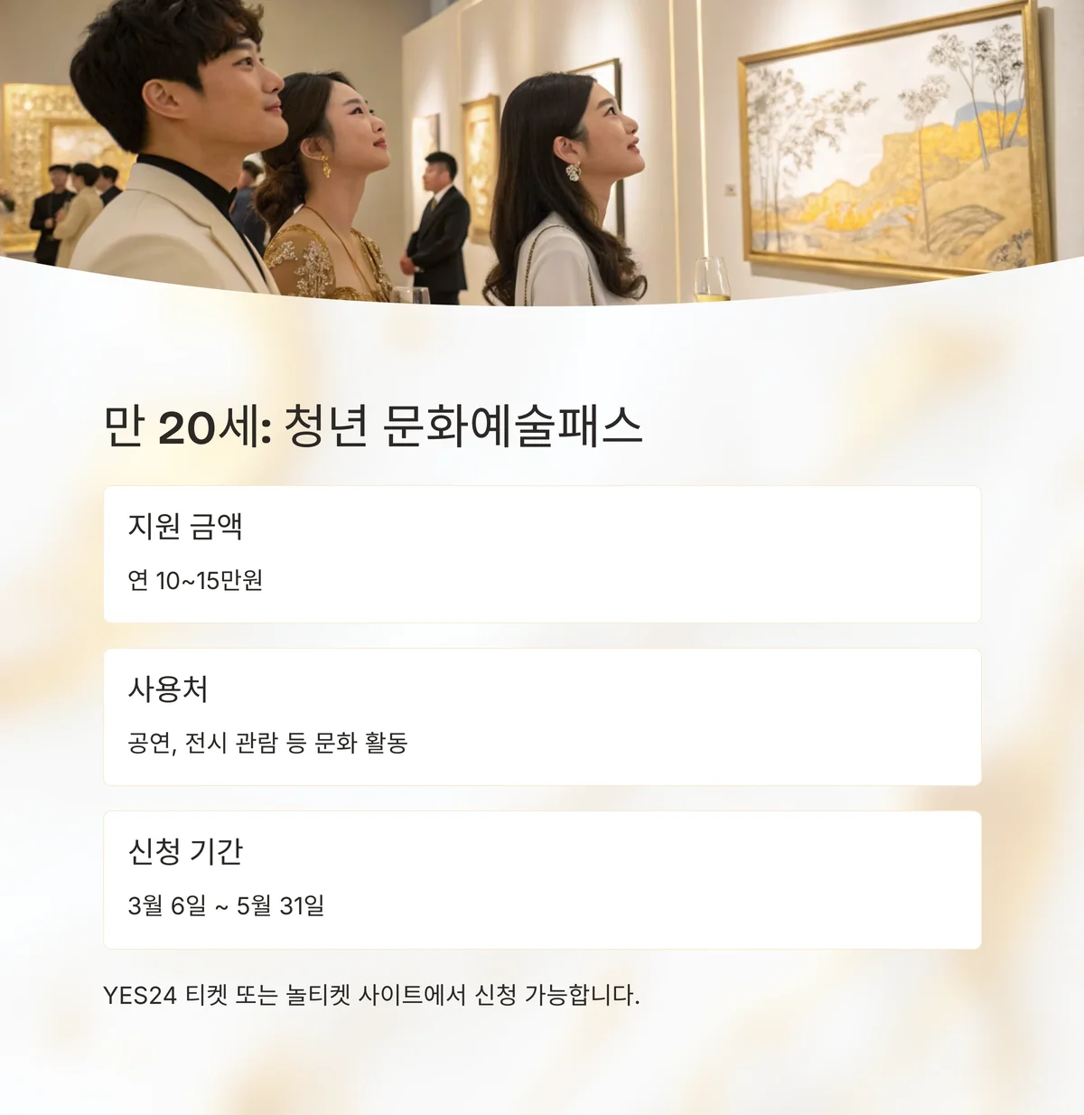 2006년생을 대상으로 한 청년 문화예술패스는 공연, 전시 관람 등에 사용할 수 있는 복지 지원입니다.