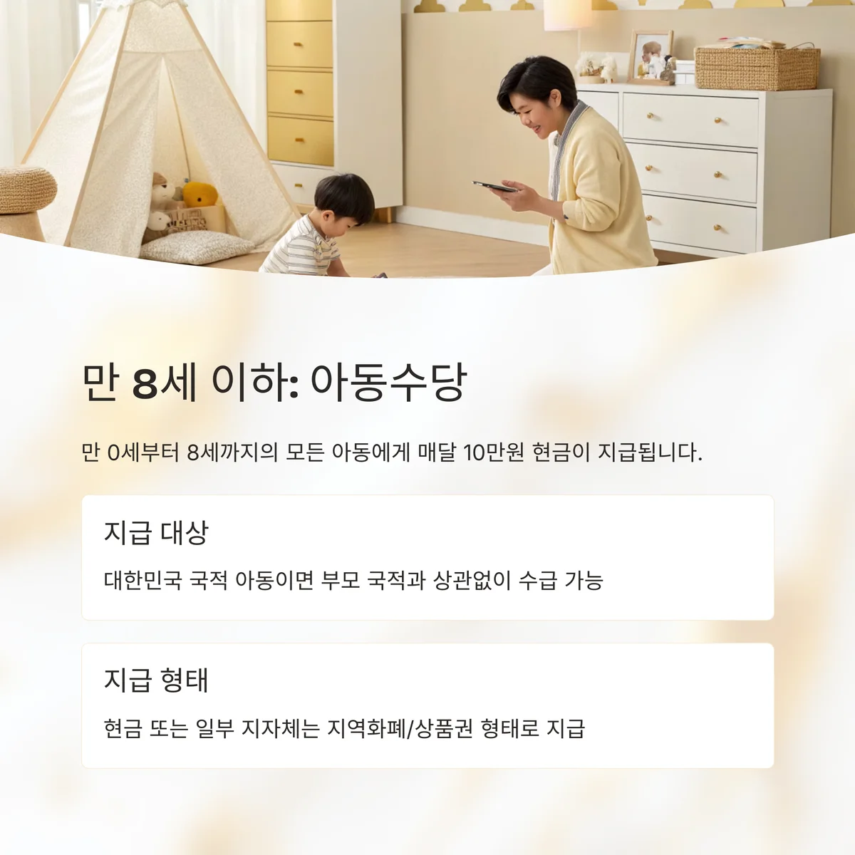만 0세부터 8세까지의 모든 아동에게 매달 10만 원 현금이 지급됩니다.