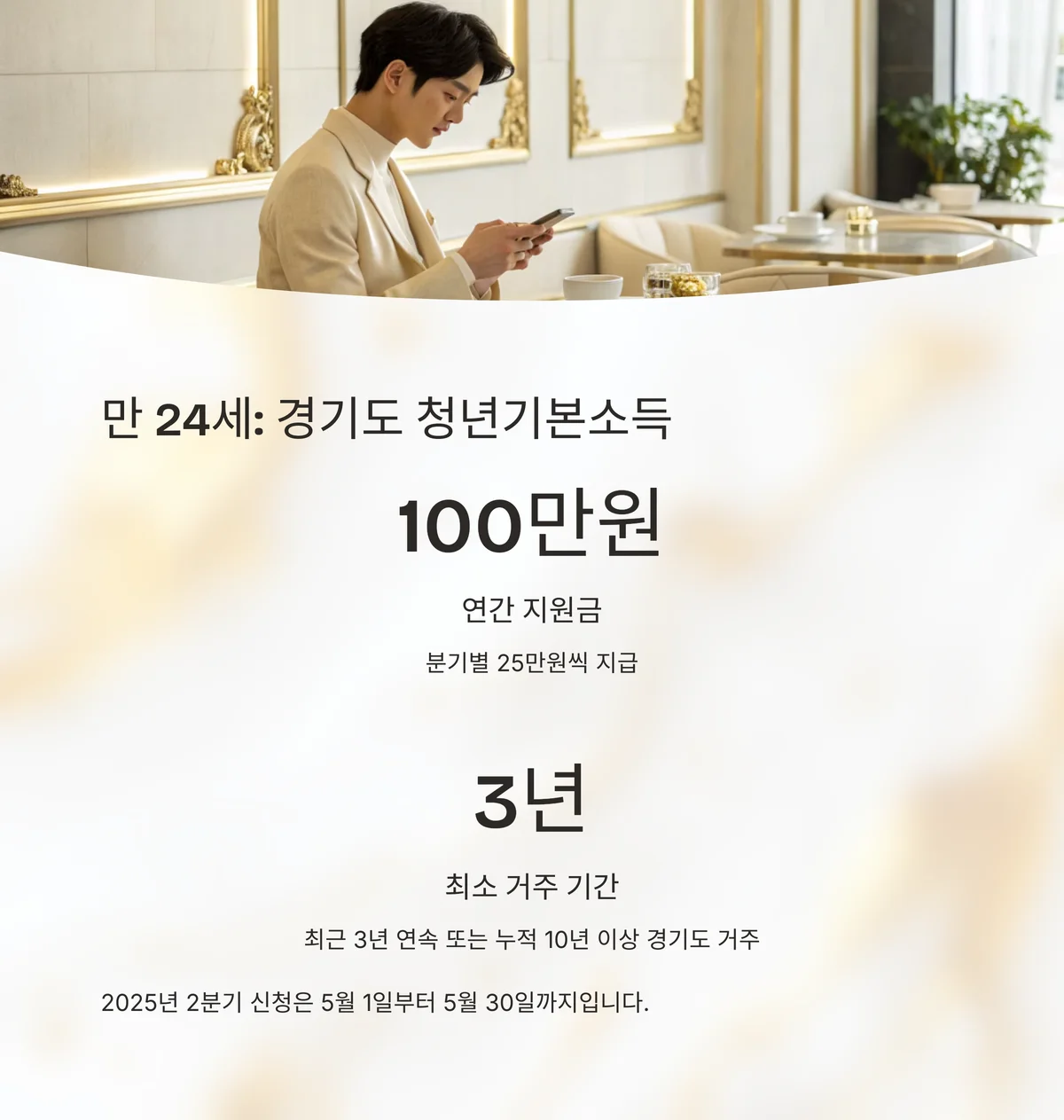 | 만 24세 청년 | 최근 3년 연속 또는 누적 10년 이상 경기도 거주 | 분기당 25만 원 | 지역화폐(카드형·모바일) |