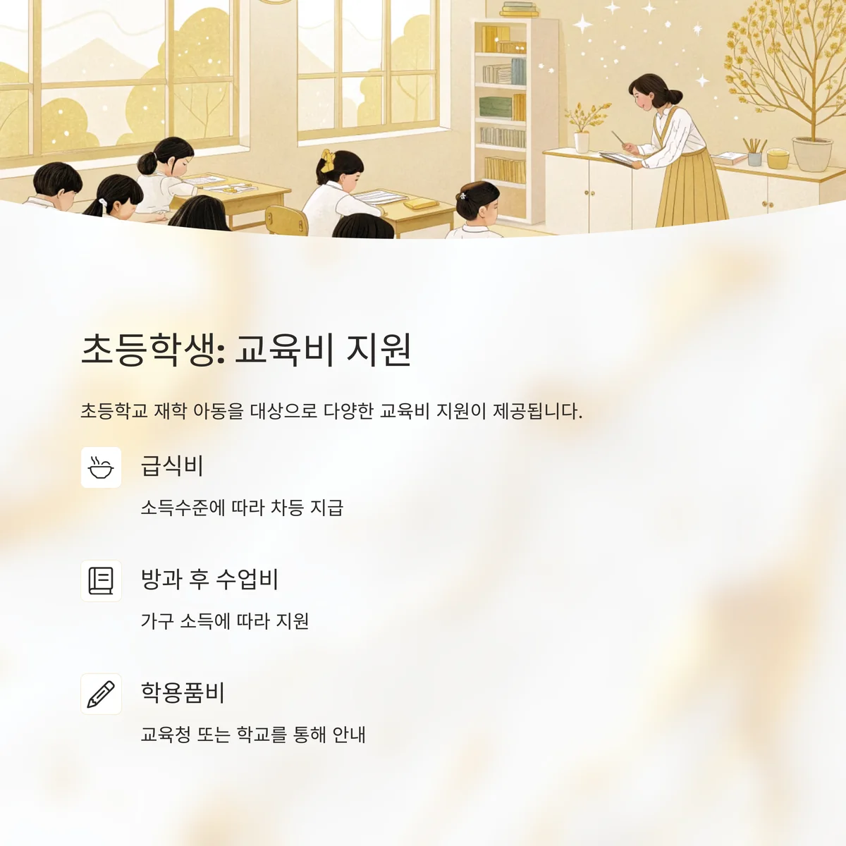 초등학교 재학 아동을 대상으로 급식비, 방과 후 수업비, 학용품비 등 교육비 일체 지원이 가능합니다.