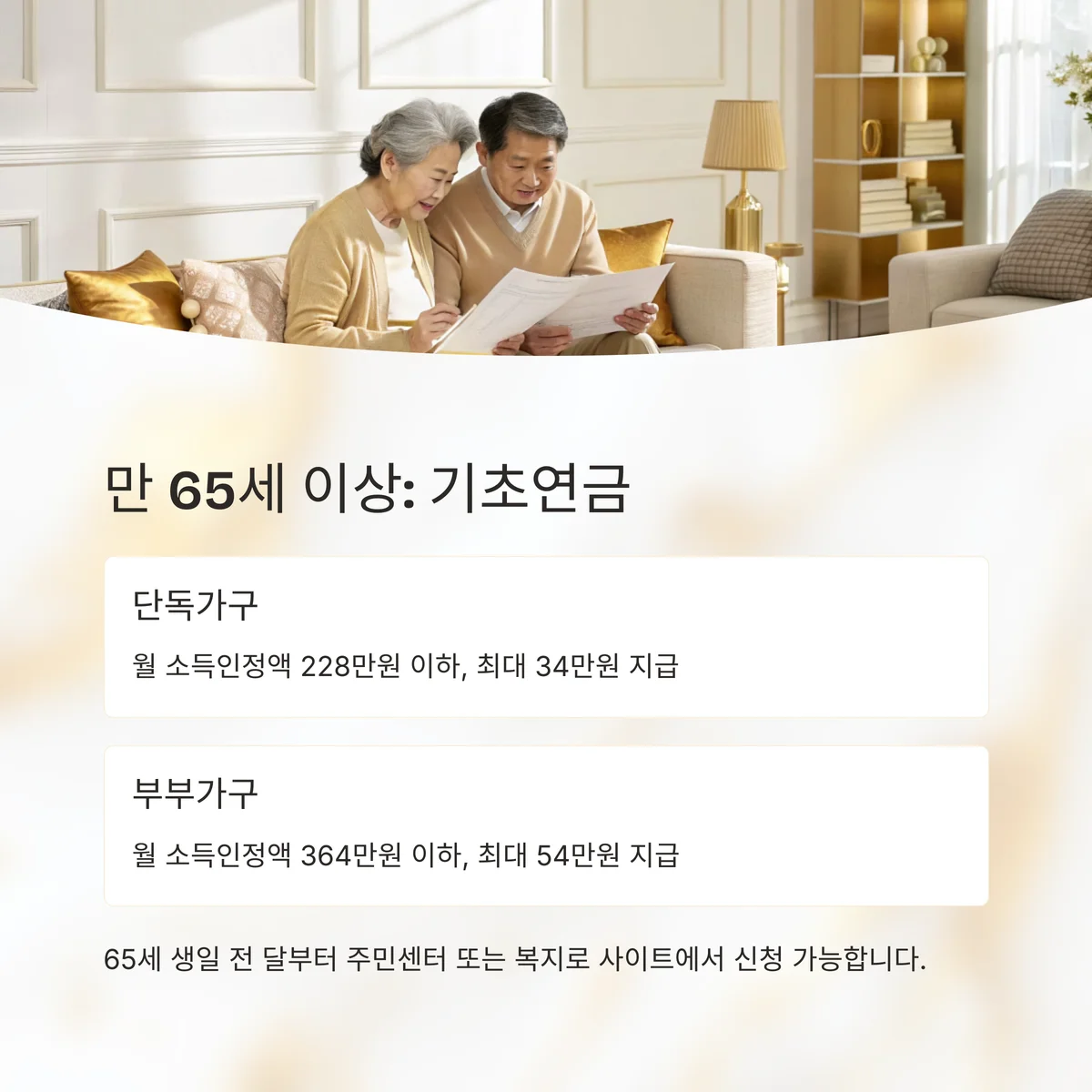 신청은 만 65세 생일 전 달부터 주민센터 또는 복지로에서 가능하며,