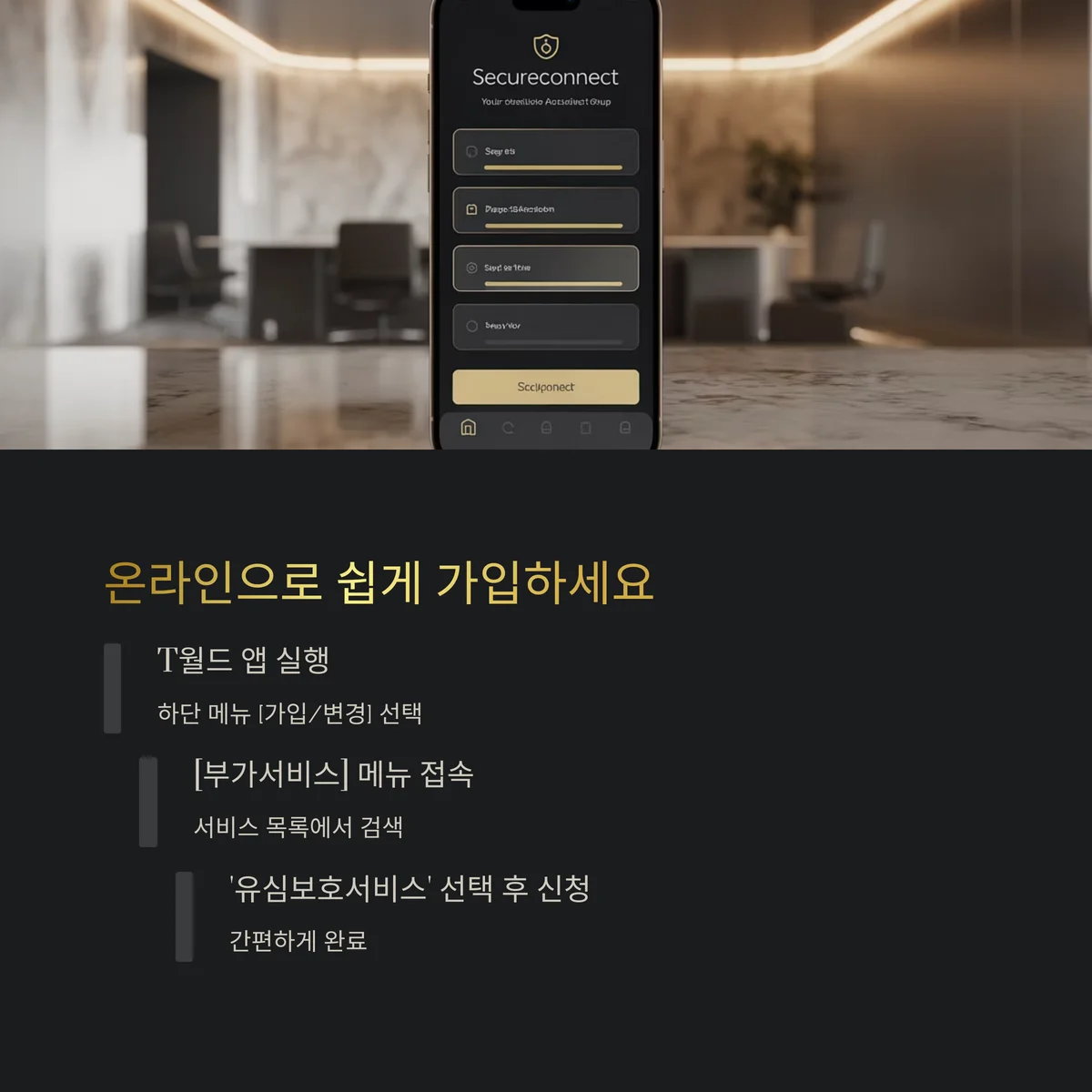 • T월드 앱: 앱 실행 → 하단 메뉴 [가입/변경] → [부가서비스] → ‘유심보호서비스’ 선택