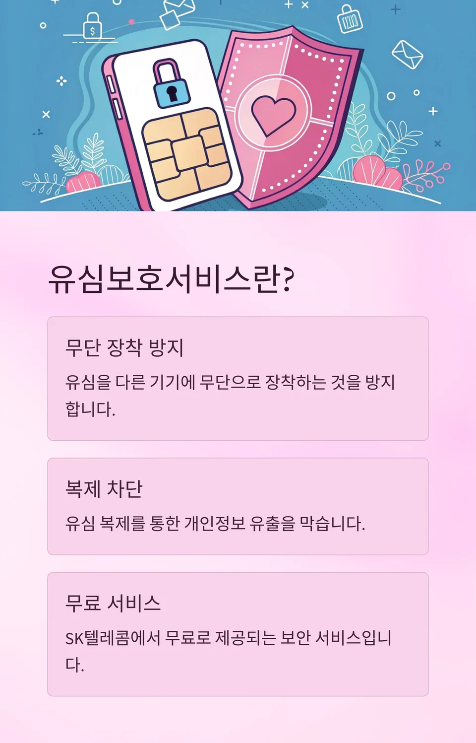 유심보호서비스는 유심을 다른 기기에 무단으로 장착하거나 복제하는 것을 방지해 개인정보 유출을 막는 보안 서비스입니다. SK텔레콤에서 무료로 제공하며, 유심 교체나 eSIM 변경 시에도 서비스가 유지됩니다.